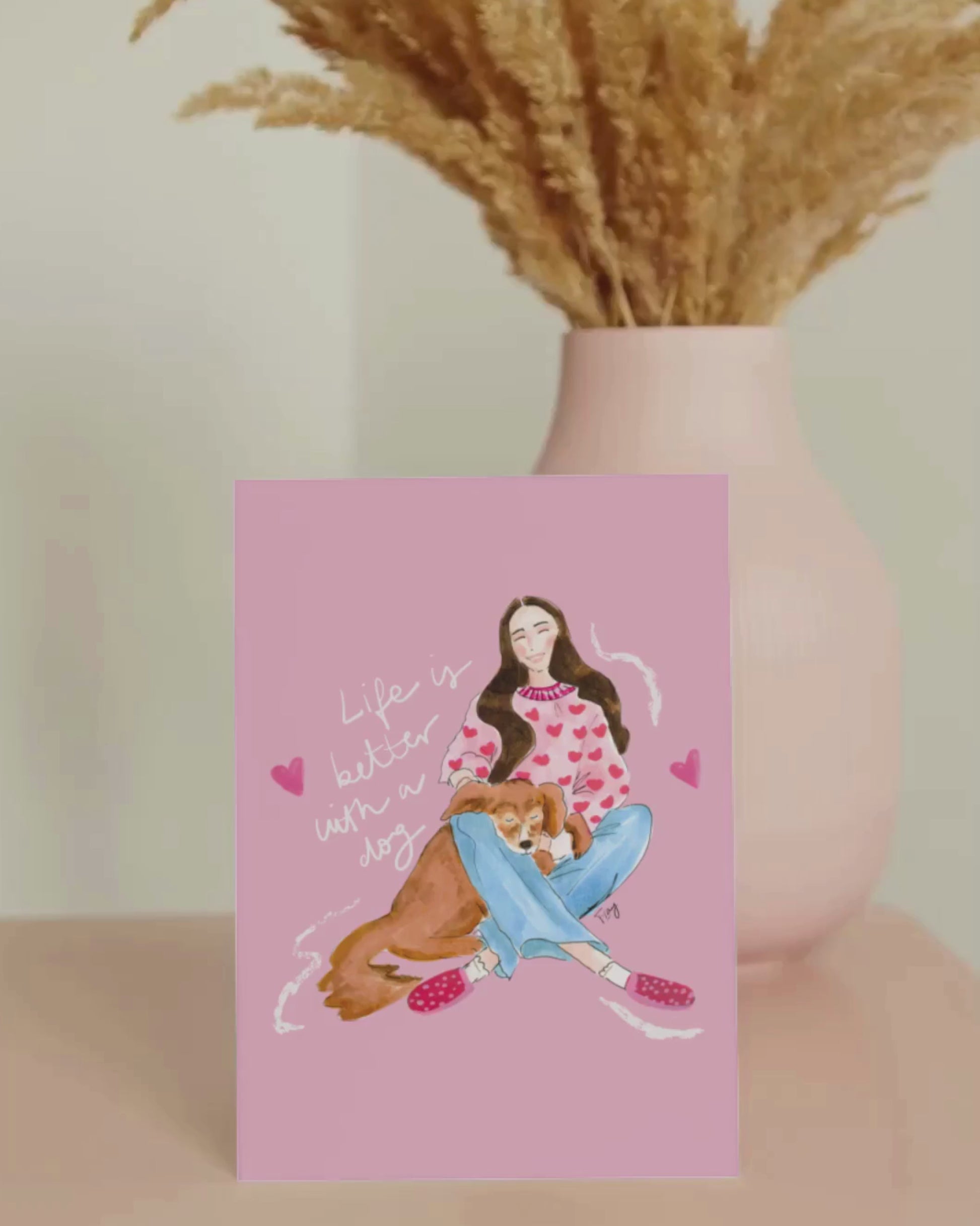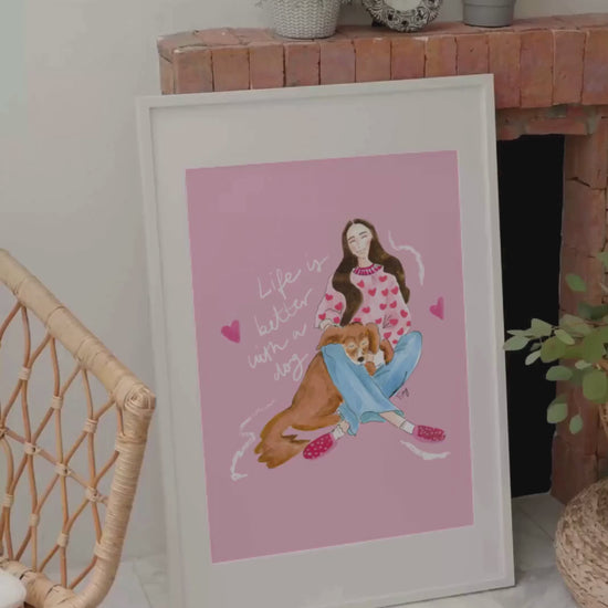 Bring love colors to your home or gifts with this original watercolor & ink illustration of a lady and her dog. Perfect for printing at home, creating your own wall art, greeting cards, or stationery, and sharing a touch of elegance in everyday life.
